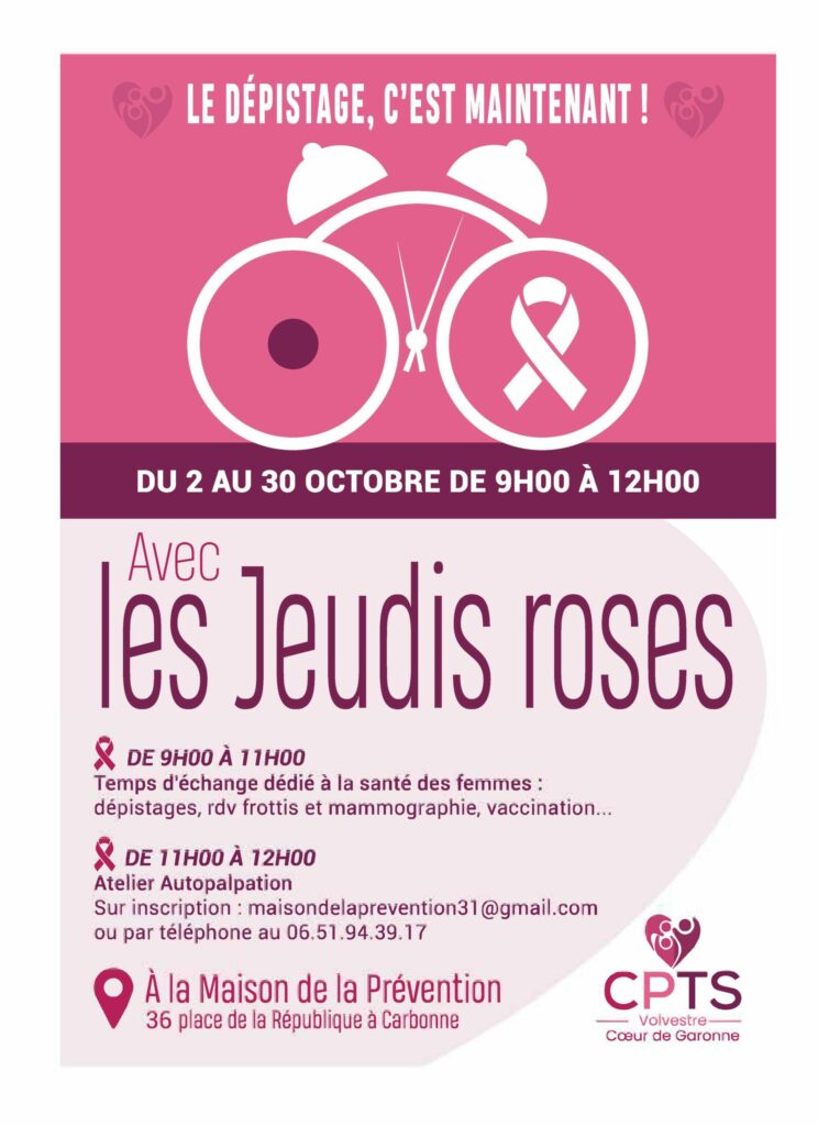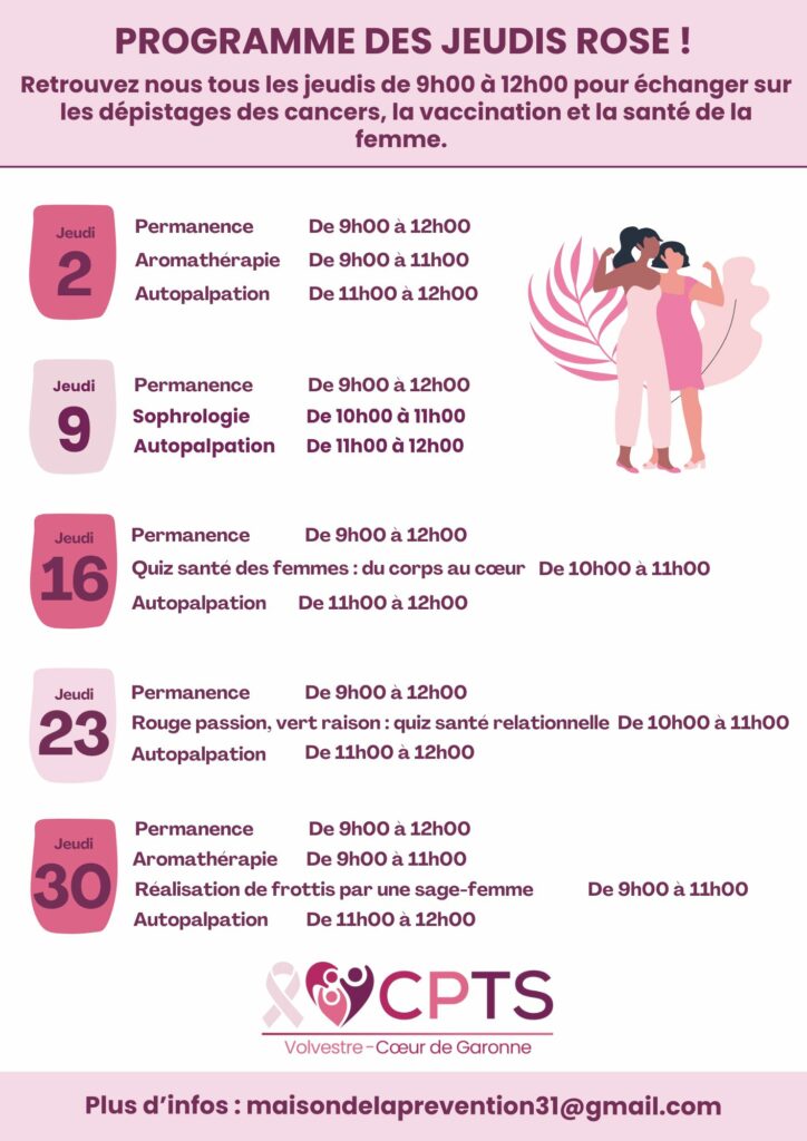 La CPTS Volvestre Cœur de Garonne, groupement de professionnels de santé du territoire et la Maison de la Prévention proposent tout au long du mois d’octobre des temps dédiés à la santé des femmes :