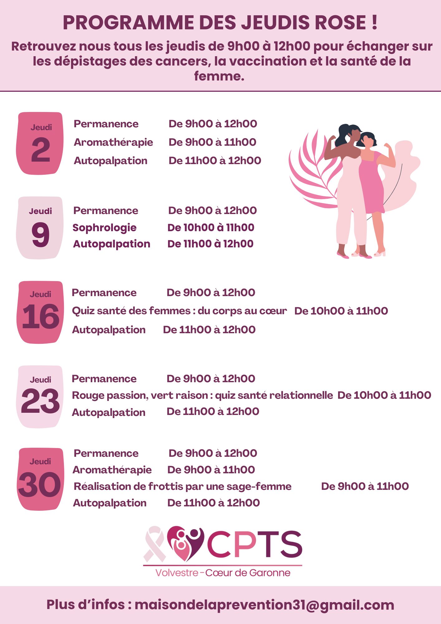 La CPTS Volvestre Cœur de Garonne, groupement de professionnels de santé du territoire et la Maison de la Prévention proposent tout au long du mois d’octobre des temps dédiés à la santé des femmes :