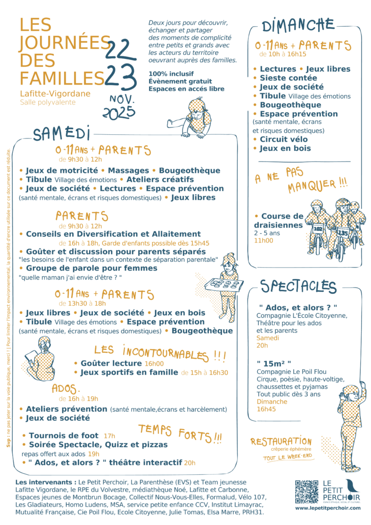 Les Journées des Familles reviennent à Lafitte-Vigordane les 22 et 23 novembre prochains ! Deux jours entièrement dédiés aux familles, aux petits comme aux grands ados, pour partager des moments de complicité, de découverte et de détente, autour d’ateliers, de jeux et de spectacles gratuits et accessibles à tous.