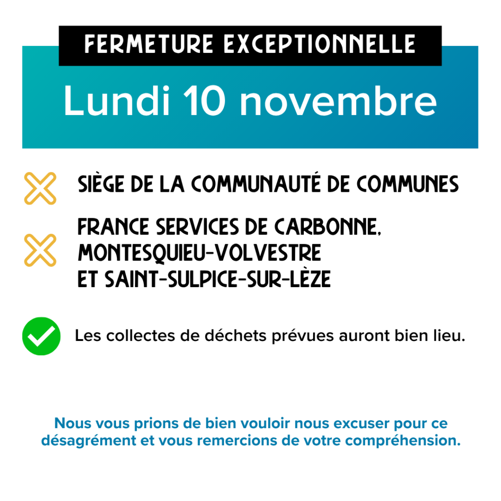 Le siège de la communauté de communes, ainsi que les France services de Carbonne, Montesquieu-Volvestre et Saint-Sulpice-sur-Lèze, seront fermés le lundi 10 novembre.