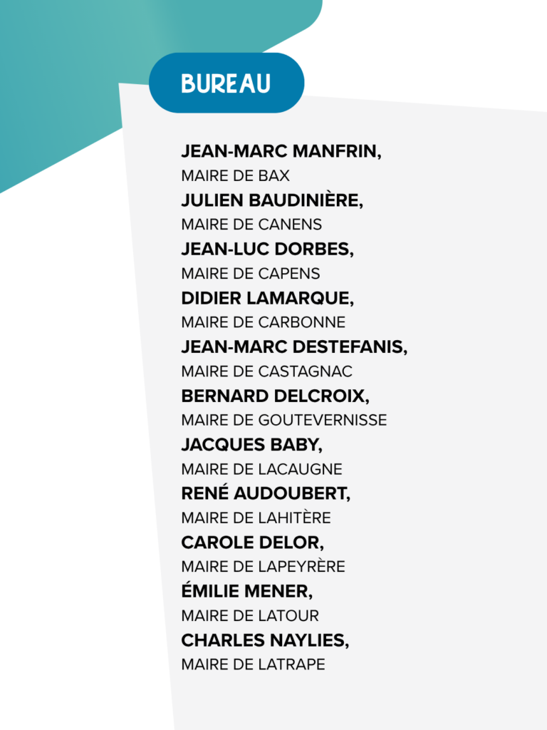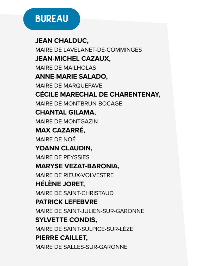 Le Bureau communautaire a également été constitué avec en complément du Président et des 11 Vice-présidents : Jean-Marc MANFRIN (Maire de Bax), Julien BAUDINIÈRE (Maire de Canens), Jean-Luc DORBES (Maire de Capens), Didier LAMARQUE (Maire de Carbonne), Jean-Marc DESTEFANIS (Maire de Castagnac), Bernard DELCROIX (Maire de Goutevernisse), Jacques BABY (Maire de Lacaugne), René AUDOUBERT (Maire de Lahitère), Carole DELOR (Maire de Lapeyrère), Émilie MENER (Maire de Latour), Charles NAYLIES (Maire de Latrape), Jean CHALDUC (Maire de Lavelanet-de-Comminges), Jean-Michel CAZAUX (Maire de Mailholas), Anne-Marie SALADO (Maire de Marquefave), Cécile MARÉCHAL DE CHARENTENAY (Maire de Montbrun-Bocage), Chantal GILAMA (Maire de Montgazin), Max CAZARRÉ (Maire de Noé), Yoann CLAUDIN (Maire de Peyssies), Maryze VEZAT-BARONIA (Maire de Rieux-Volvestre), Hélène JORET (Maire de Saint-Christaud), Patrick LEFEBVRE (Maire de Saint-Julien-sur-Garonne), Sylvette CONDIS (Maire de Saint-Sulpice-sur-Lèze), Pierre CAILLET (Maire de Salles-sur-Garonne).