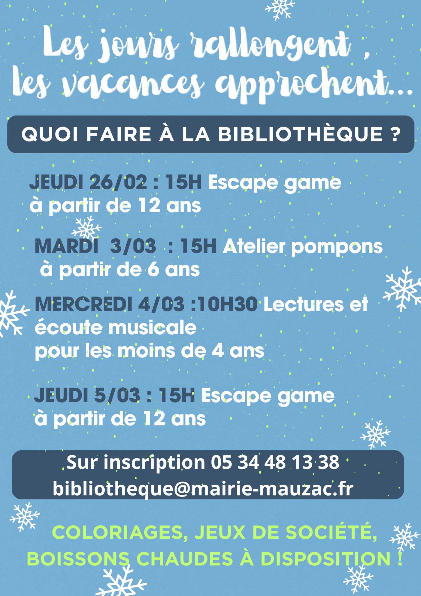 Découvrez la programmation complète de la médiathèque de Mauzac pour les vacances de février ! Ateliers, animations, découvertes… il y en a pour tous les goûts et pour toute la famille.