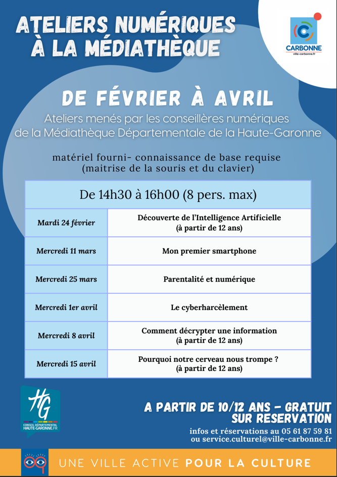 Participez aux ateliers numériques de la médiathèque de Carbonne et devenez incollable ! Des sessions ludiques, utiles et accessibles à tous pour découvrir, apprendre et booster vos compétences digitales.