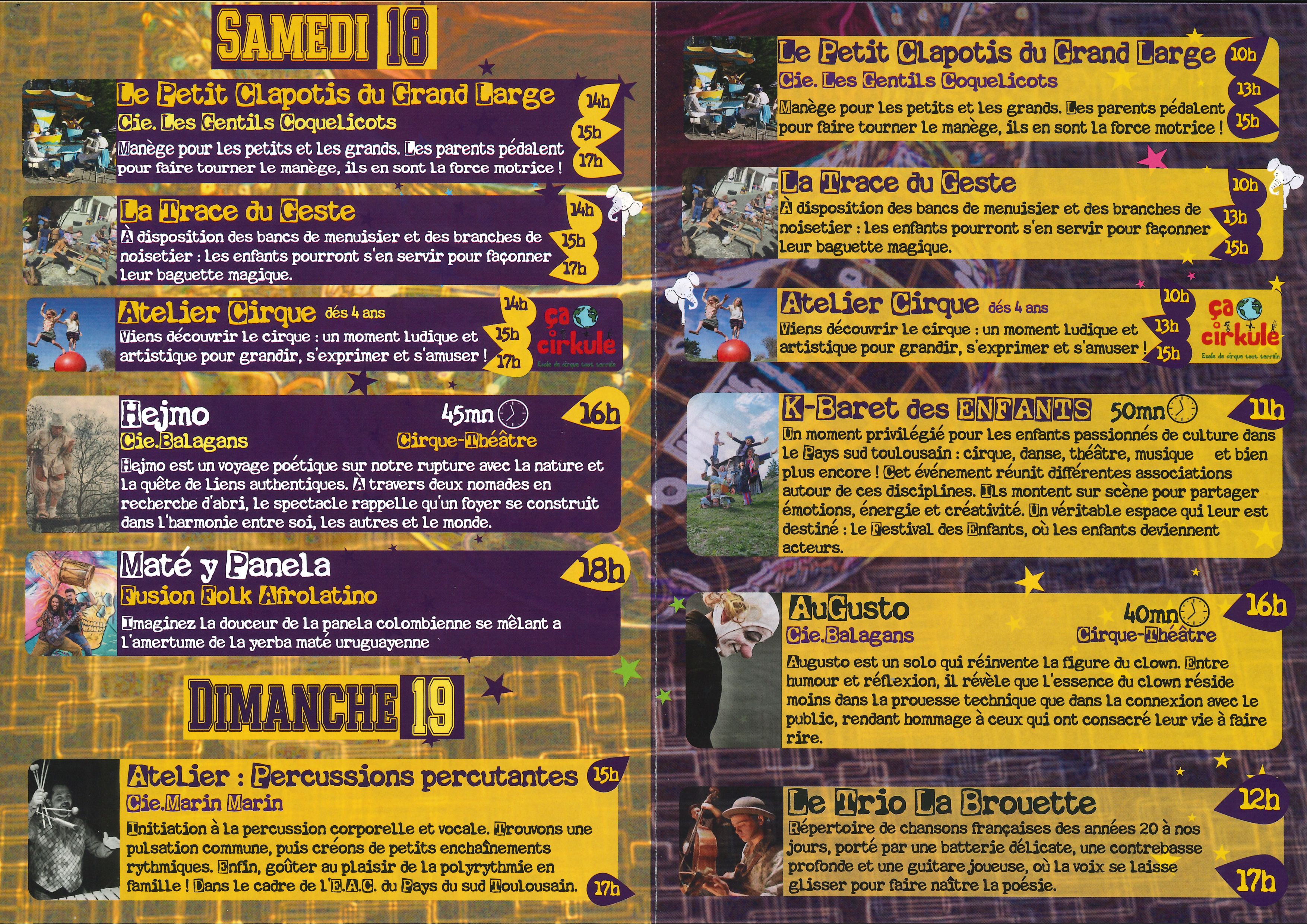- K - Baret des enfants à 11h (50min) : des associations montent sur scène et invitent les enfant à faire de même pour leur transmettre leur passion pour le cirque, la danse, le théâtre et la musique.